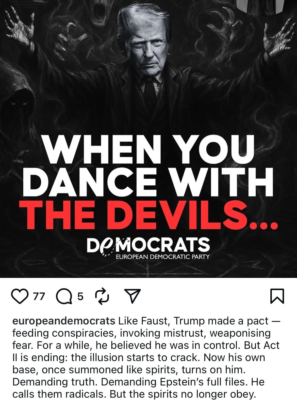 2025 Temmuz, Avrupa Demokratik Partisi tarafından paylaşılan bir sosyal medya gönderisi, yalnızca Trump karşıtı bir siyasi yorum değil; aynı zamanda çağdaş mitolojiyi hedef alan bir siyasal sanat eseri gibiydi. Görselde, Donald Trump cehennemi bir fon önünde, şeytani figürlerle çevrili biçimde resmedilmiş, altında ise şu cümle yer alıyordu: “When you dance with the devils…”. Metin, Trump’ın Faust gibi bir pakt yaptığı; komplo teorilerini besleyerek, korkuyu silah hâline getirerek ve sonunda kendi çağırdığı karanlık güçlerin kontrolünden çıktığı fikrini işliyordu. Bu görsel ve yazılı gönderi, yalnızca çarpıcı değil, aynı zamanda düşündürücüydü: Çünkü içinde bir hakikat barındırıyordu. İşte ilham noktam burası. İki laf etmesem içimde kalır. Başrolde Trump var, ama kuliste bekleyen başka karanlık figürler de var.